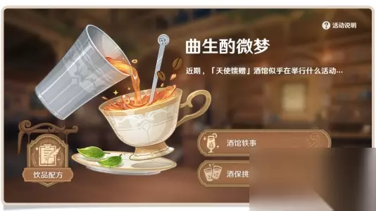 【曲生酌微梦】活动介绍 〓活动时间〓 活动时间:2022年3月10日10点整-3月21日03:59; 曲生酌微梦·后记任务:2022年3月21日04:00-2022年3月24日03:59 〓参与条件〓 玩家冒险等级提升至28级或者以上; 魔神任务间章的第一幕风起鹤归; 优菈传说任务浪沫之章·第一幕浪花不再归海; 活动有效期内接取浪沫之章·第一幕浪花不再归海需要的冒险等级会调整到28级并且不消耗传说钥匙。 调制方法: