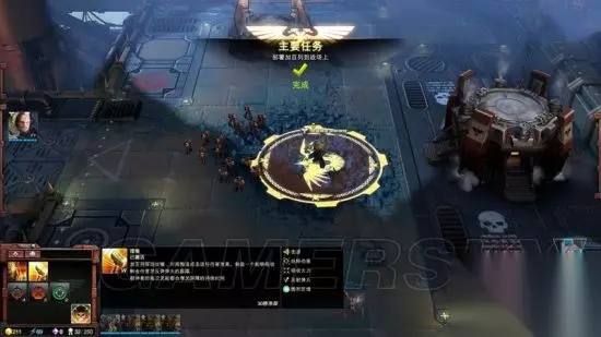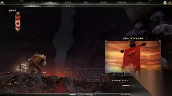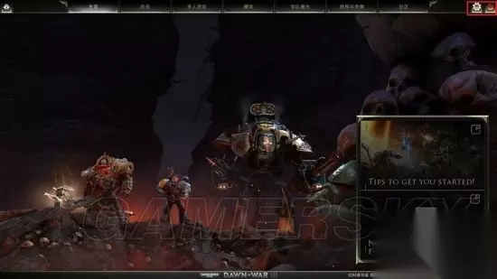 菜单界面 主界面右上红框内是视频、音频等设置以及退出游戏的快捷键。 战役:游戏的剧情流程,玩家跟随战役接触3大种族的故事,攻关战役可以获得颅骨货币。 多人游戏:游戏的竞争(竞技)性多人玩法,玩家可以相互配合攻守,达成击败对手玩家组合的目的。多人游戏也可以获得颅骨货币,用来购买、解锁精英、皮肤涂装等物品。 精英:游戏里的英雄单位,具有强力的战力和技能。 军队着色:通过解锁各类主题,给你的部队个性化外观。