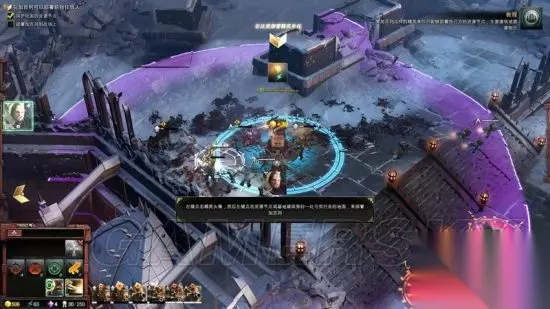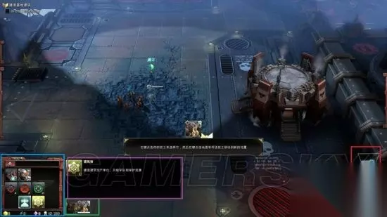 主界面 左下蓝框为单位、建筑功能区,查看建筑和单位的能力、修建和升级项目。 功能区旁边的紫框内是详细说明,下方绿框则是部队和在建部队的列表。 右下红框内是小地图,点击可以快速到达指定位置查看。 最右下黄框是讯息扭,玩家可以点击后在地图上放置攻击、防御、侦查等信息,队友可以看到并回应你的指令。是多人游戏交流的有效手段。