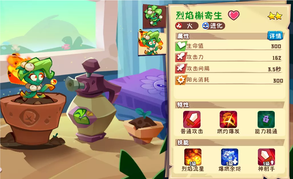 攻击力极强,可以在烈焰植盒和普通植盒中开出,大招是烈焰流星,可以进行多行打击,打击范围特别大,特别厉害。阳光225,虽然阳光要的多,但是攻击力特别强,建议每局游戏都带上它