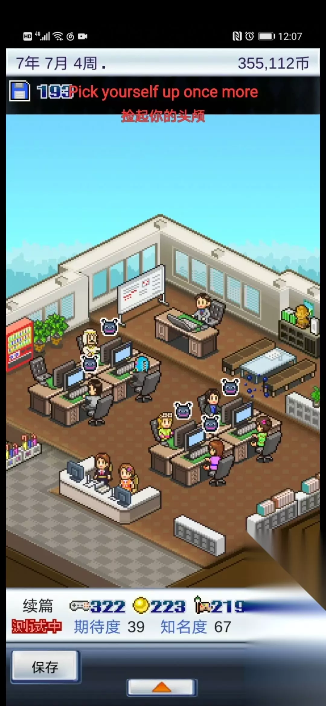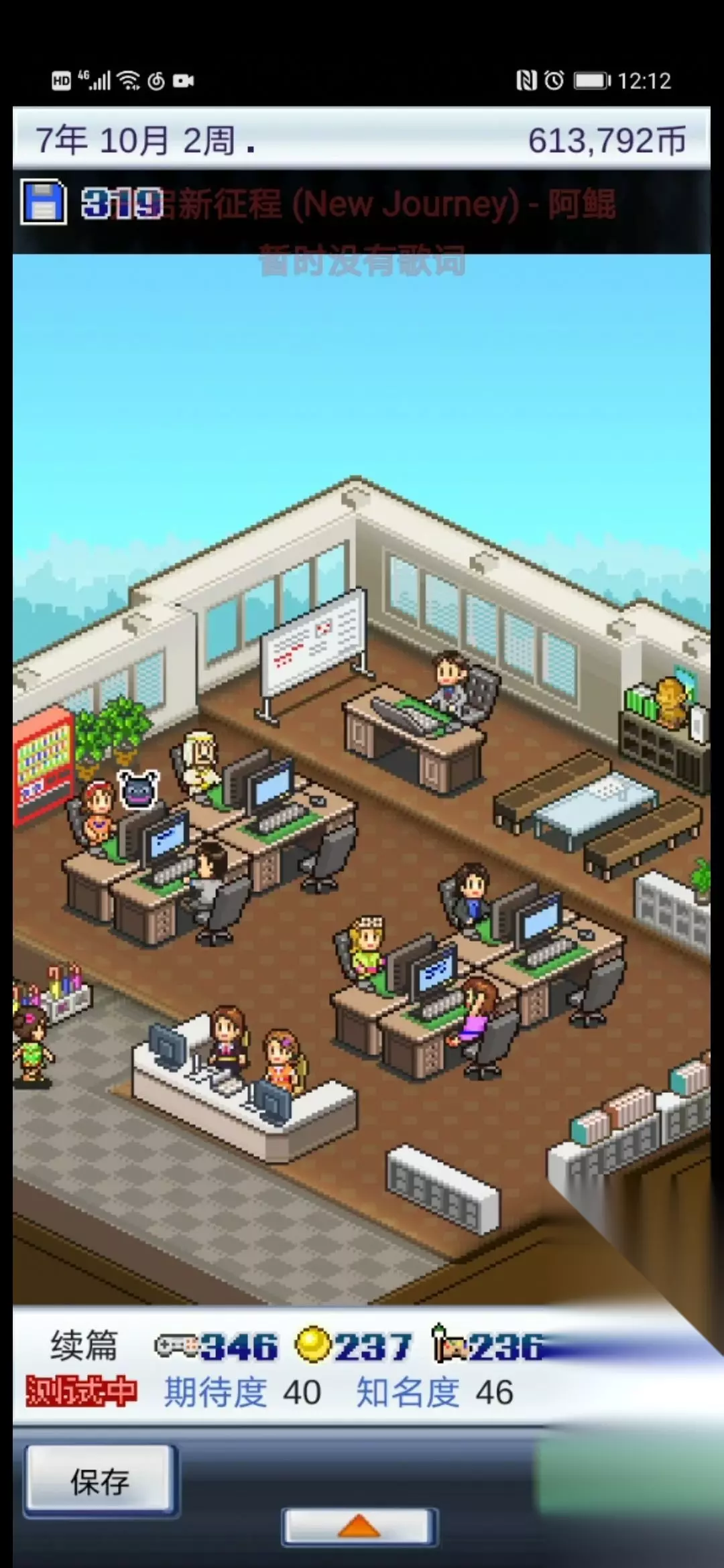 11.说下4年两奖的一个小问题和培养的小技巧。4年评两奖的时候,貌似是会优先评音乐奖,后评美术奖。什么意思呢,就是如果你有两部作品音乐都是50+,那音乐比较高的那部作品会拿音乐奖。所以,如果想拿美术奖的那部作品音乐太高的话,就可能会被音乐奖截胡。这个是我玩的时候感觉出来的,具体是不是没验证过,不知道有没有大神知道的。 还有就是培养的时候,等员工回了家再去培养,他就会一直在家里待着不出来(就像现在的我们),在家里回复体力直到回满。这样培养的好处就是员工在家里回复体力很快,不用来回跑,节省时间。 12.最后说下,4年5月的时候钱不够买转职书没有关系的,其他年份都买了转职书那在9年开终极主机完全是够的。