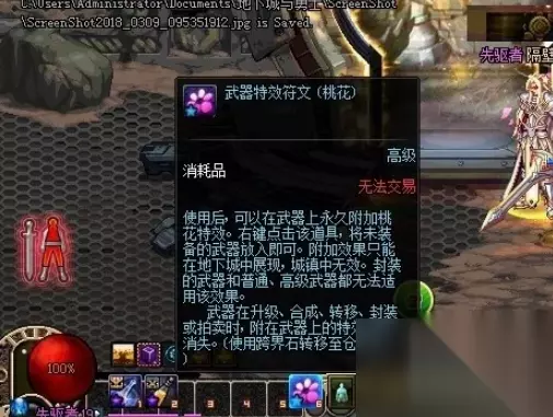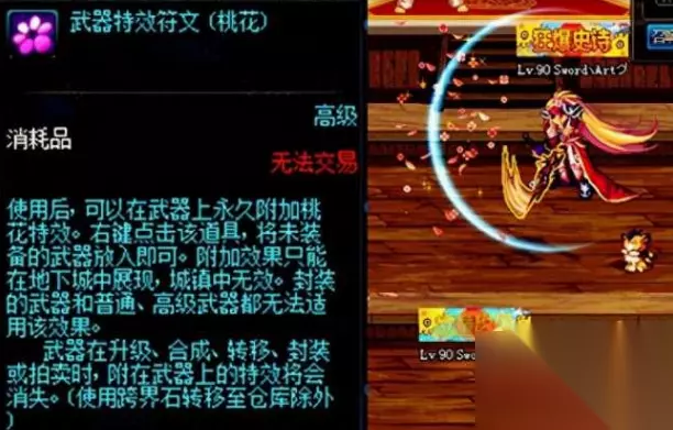 2.武器特效符文(桃花) 在商城中,武器特效符文(桃花)是可以赋予武器特效的唯一道具,在赋予到武器之后,进图攻击时,不仅有桃花的特效,同时在站街的时候也有红色的残影特效,如果玩家觉得难看,也可以花100点券买解除特效符文进行解除。