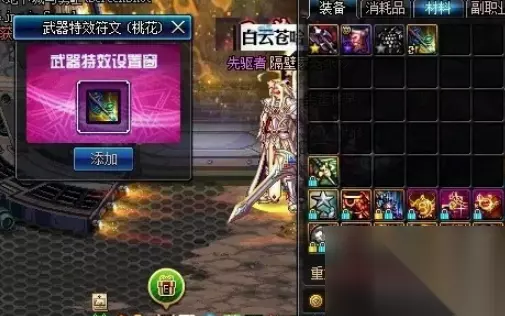 4、右键特效桃花符文,跳出一个非常漂亮的【武器特效设置窗】。将要附加桃花特效的武器拉进去。