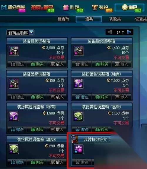 2、按照【道具】——【道具】选项,就可以在最下方找到【武器特效符文(桃花)】了。 售价1800券/个。