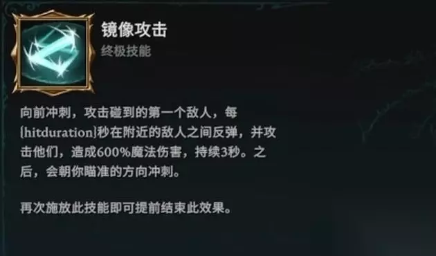 另一个终极技能是镜像攻击,攻击敌人之后会进行弹射总共持续三秒钟,每秒会附带六倍的魔法伤害。技能发动时自身处于无敌状态,结束时额外可以使用一次冲刺。该技能基本没有短板,不过由于持续时间太短总输出也不会太高。