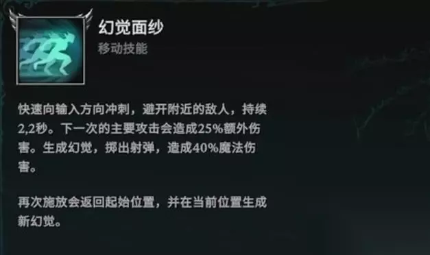精灵之舞技能可以召唤出三枚魔法弹围绕自身,击中敌人以后会造成少量法强伤害。可以主动释放魔法飞弹击中敌人之后会削弱敌方输出,实战比较好用发射间隔大概为三秒左右,玩家可以自由控制释放时间。迷雾幻影是非常强的防御技能,能抵挡包括重击在内的所有伤害。抵挡成功之后会暂时变为非物质状态,并且传送到当前鼠标的指定位置。在传送的过程中玩家是无敌的,因此可以用来绕过各种陷阱。 幻觉面纱是位移技能冲刺时会自动避开周围敌人的伤害,同时生成一个可以发射魔法弹的幻影,如果再次使用技能就可以返回原点。幽灵守护者是终极技能之一,可以召唤出一只石巨人持续七秒钟,巨人的护盾强度不高同时攻击方式也比较单一。