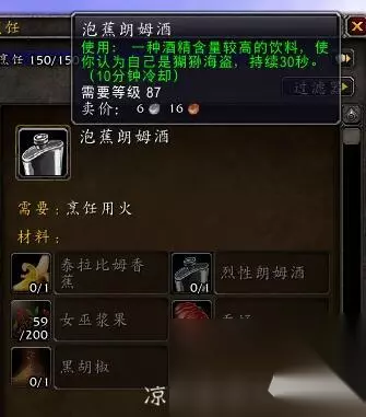 这个食谱是群岛钓友——瓦尔莎拉钓友出售的,破碎群岛的阿苏纳(43.40)、瓦尔莎拉(53.72)、至高岭(雷霆图腾32.41)、风暴峡湾(90.11)、苏拉玛(50.50)、破碎海滩(33.50)这六个点依次序刷新群岛钓友,每个只持续一天,今天(19号)是苏拉玛,明天破碎海滩,后天阿苏纳,依次循环。 到那里有一个NPC钓鱼大师,前面是一个可以钓鱼的小水潭,你在水潭钓鱼时候有较小几率钓起来一种特殊货币,如果你能钓起来一个召唤怪物的道具,召唤怪物且击杀,那么这个小水潭在五分钟内是百分百每一杆都是特殊货币的,把特殊货币交给钓鱼大师可以获得声望,声望达到一定程度可以在钓鱼大师商店买玩具或者食谱、小宠物等等,上版本钓鱼人多基本上二十多人钓鱼团可以保持怪物状态不断,这版本找不到人的话就很麻烦了。 泡蕉朗姆酒 喝了之后会觉得自己是猢狲海盗,持续30秒: