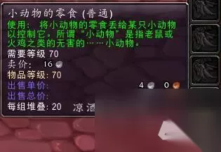 诺森德达拉然钓鱼日常也有几率获得一个“浸水的账单”,好像是叫这个名字,提供一个任务完成之后给5个美食徽章,可交易。 小动物的零食 小动物的零食可以让你暂时控制小动物,比如老鼠、火鸡等小动物: