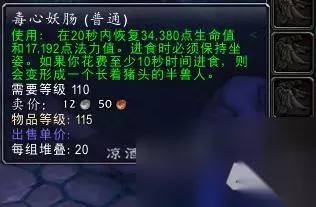 获得该图纸在潘达利亚——卡桑琅丛林(52.89)那里偶尔会刷新一个宝藏酒桶,打开即可获得该图纸和一两个成品,注意需要学习了熊猫人烹饪,不然可能因为bug无法获得图纸,且该宝藏只可以打开一次,如果因为bug没有获得图纸,那么这个角色这辈子就拿不到了。 我三个服务器都没有刷新宝藏,制作要的女巫果果也太多了,我服AH也收不够,所以没法测试实际效果是什么,应该是变身一个猢狲吧,获得的太久了忘记了。 毒心妖肠 可以变身为长了猪头的半兽人: