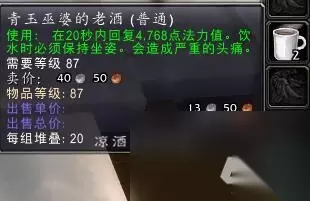 根据醉酒程度不同需要的咖啡数量也不同,轻度喝醉只需要一两杯,喝到吐那种程度需要七八杯才能完全清醒。 该食谱是暴风城或者奥格的烹饪供应商出售的,同样需要美食徽章,而且主要材料的可可豆也是用美食徽章买的,不过很便宜,一个徽章买的一箱可可豆可以做50杯左右咖啡。 青玉巫婆的老酒 喝酒会头痛,可以说很真实了,还好我准备了很多咖啡: