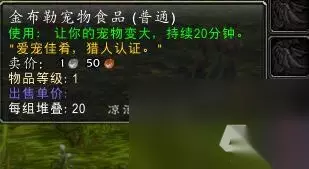 只能对小动物用,像那种3级黄名的野兽鹿、绵羊等都不能用,鹰身女妖也不能用。(划去) 该食谱同样也是上面的诺森德达拉然烹饪供应商出售,同样需要美食徽章。 金布勒宠物食品 一个可以让宝宝变大的食物,只对像法师水元素、猎人宝宝、术士宝宝这种战斗宝宝有效: