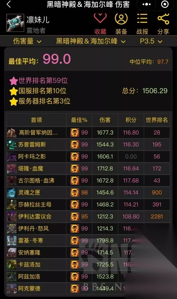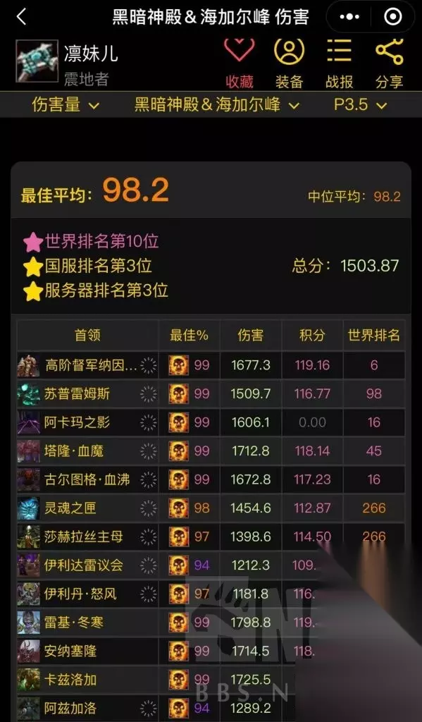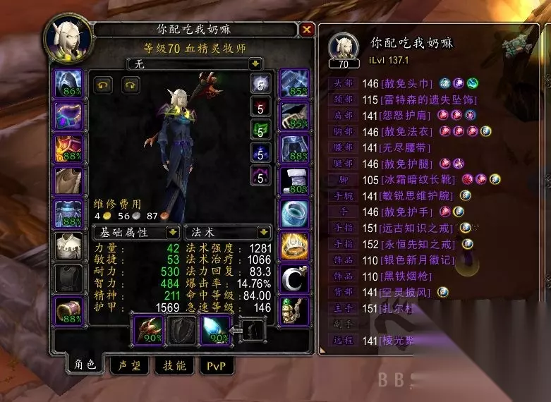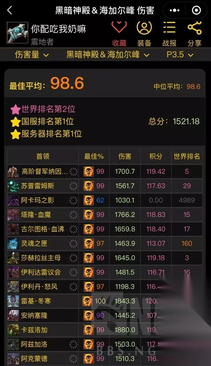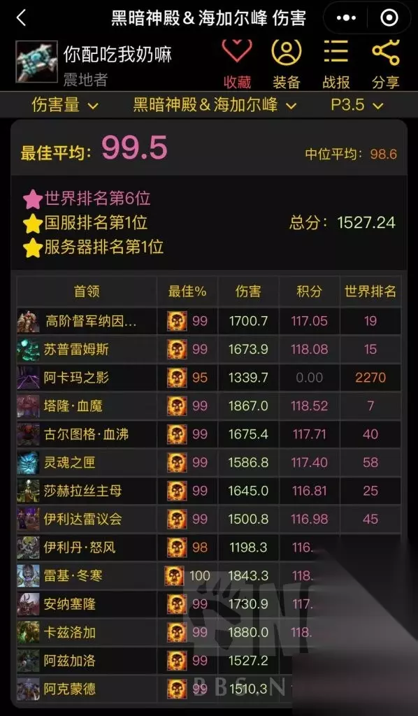 其实说这么多,我自己也会觉得唠叨。一些什么绿字,三围收益转换什么的,已经有大神分析过了。。。我是属于那种玩游戏不太会算数据的,WCL抄作业或是感觉什么好用带什么即可。数据类我觉得我分析的也没有理论支持,看着带就行,急速能带即带,好用的,暴击其实也是有用的,别看一场战斗下来鞭子伤害占比最多,但别忽视震,灭的作用。鞭子是靠长时间去填充的伤害,震,灭最好用且浪费你的战斗时长最短,不要一味沉迷一套,哎呀 TBC急速又不加DOT跳频,暴击又不会增加鞭子和触痛的几率这类理论。说实话挺幼稚的。用更短的时间打出最大的输出效益才是关键。 还有就是,暗牧在TBC想纯打爽是不可能的,打得高更多的还是依仗团队,团队打的快才是上分关键(我的小暗牧就是最有说服力的,别太去纠结装备构架哪里配装好了不好了之类的)否则就算你头脑清晰,理论知识无敌,装备优异,但却在一个你暗牧都能打进前几的团队,你依然是《没有伤害的》。也别太纠结有没有嗜血啊 造神啊 之类的,现在正经的团队 暗牧吃到单嗜血 已经很满足了。且需要带项链。至于电萨,鸟德,团队收益最大化也不会给你的。 下面是我小暗牧,这个暗牧就吃到了鸟德且不用带项链 就很美滋滋。