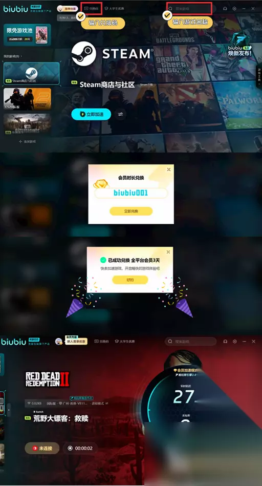 在神射手挑战的后期,任务难度逐渐增加,包括了一枪毙命杀死三头熊、在不装填弹药或更换武器的情况下杀死六只野生动物等。这些任务要求玩家具备极高的射击精度。在面对熊等猛兽时,玩家需要保持冷静,选择合适的时机和角度进行射击。但是大家在进行这些高难度射击时,卡顿、掉帧等网络问题往往会成为获取成就作不确定的因素,影响射击精度和游戏体验,使用加速器优化网络连接,减少网络延迟,是确保任务顺利完成的关键。其实只要用biubiu加速器就够了。 而且现阶段biubiu的活动奖励也很丰富,新人注册到biubiu的话就有24小时的免费加速时间可以直接领取,而输入兑换码【biubiu001】更是可以再叠加长达72小时的免费加速时间,这样总共能领到96小时的免费加速时长!