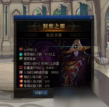 【洞察之眼:复活神殿】:需要进入特殊频道洞察之眼才可进行队伍建立。必须四人组队才可进入。