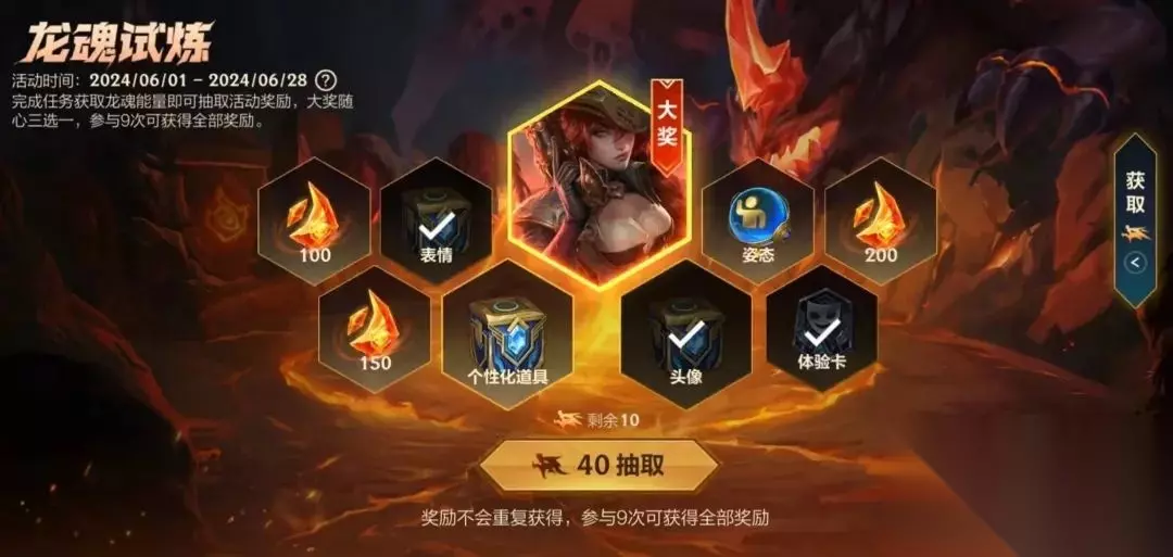 活动:龙魂试炼 时间:截止至6月28日 奖励:女帝 厄运小姐,龙魂水晶*3000,专属大奖