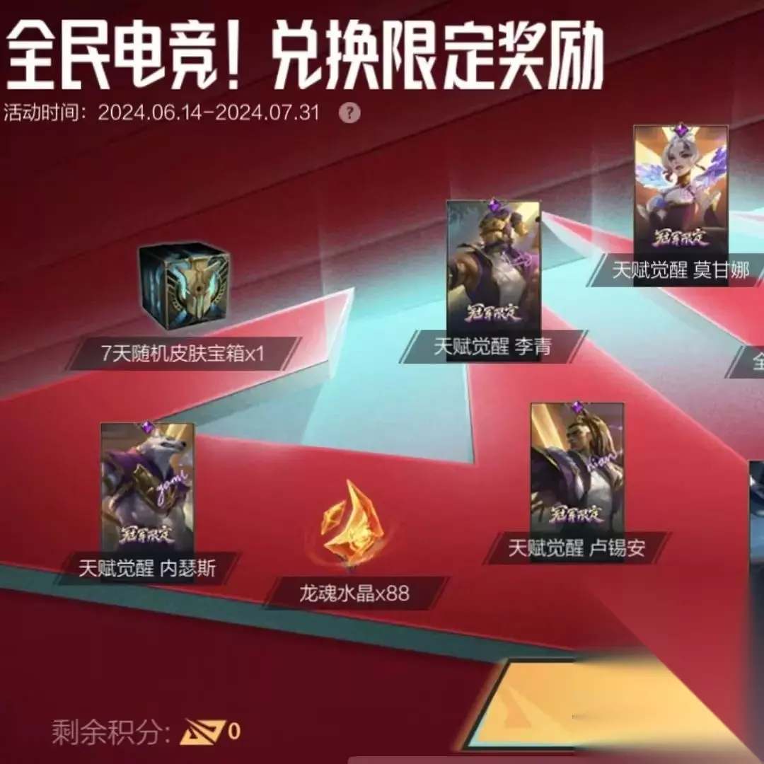 活动:全民电竞!兑换限定奖励 时间:截止至7月31日 奖励:天赋觉醒系列皮肤,玉剑传说 苍鸾 莫甘娜,神龙守卫 加里奥,全英雄畅玩卡,7天随机皮肤宝箱,双倍晶石卡,龙魂水晶