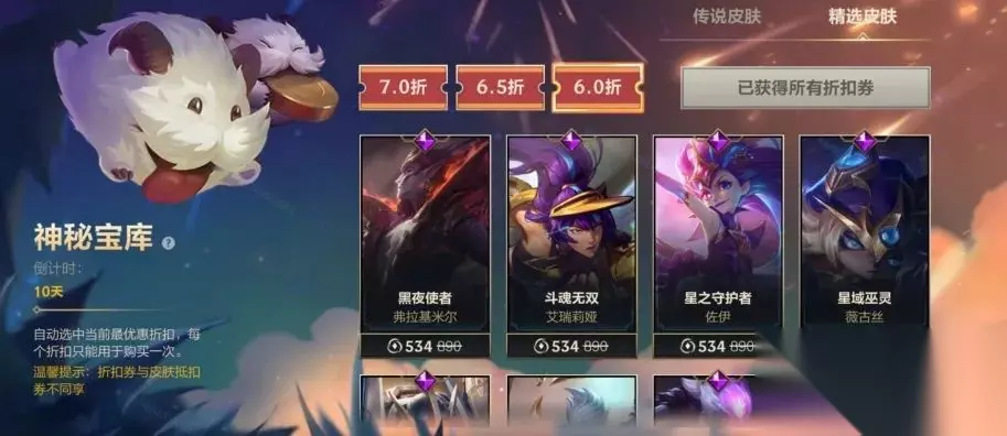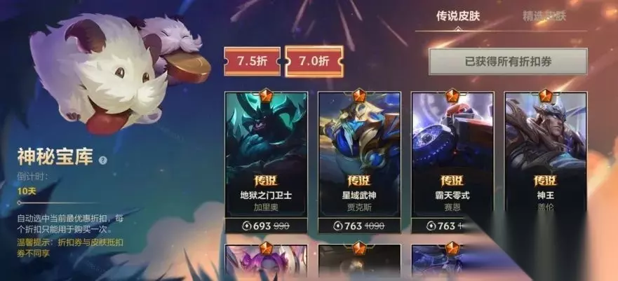 折扣券获取 神秘宝库活动期间,每位召唤师可通过以下方式获得最多5张折扣券: ● 免费抽取:2张精选皮肤折扣券和1张传说皮肤折扣券。 ● 额外购买:消耗蓝色晶石*3000,获得1张精选皮肤折扣券或1张传说皮肤折扣券。 折扣券使用 ● 折扣券可用于购买神秘宝库中的精选皮肤和传说皮肤,每张折扣券限用1次。 ● 可购买3款精选皮肤和2款传说皮肤,购买时会自动使用当前最优惠的皮肤折扣券。