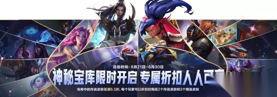 峡谷中隐约有金光闪出,到底发生了什么事情?待隆哥去一探究竟~ 神秘宝库 限时开启 神秘宝库限时开启,专属折扣人人可享!6月21日至6月30日活动期间,神秘宝库限时开启,每位召唤师最多可获取5张皮肤折扣券,传说皮肤低至6.5折,召唤师们走过路过不要错过~