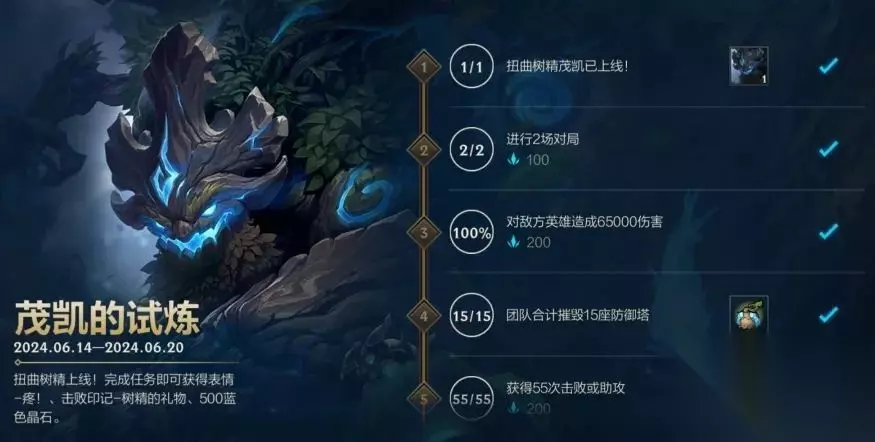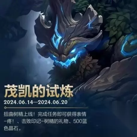 活动:茂凯的试炼 时间:截止至6月20日 奖励:局内表情-疼!,击败印记-树精的礼物,蓝色晶石*500