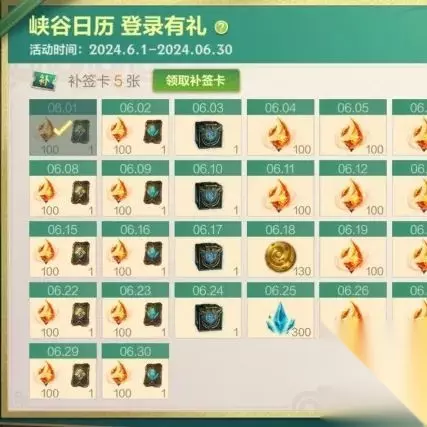 活动:峡谷日历 登录有礼 时间:截止至6月30日 奖励:深渊之骰(3天),心花怒放,任务卡,皮肤姿态甄选宝箱,史诗皮肤限时体验自选奖励