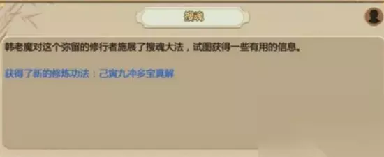 1. 秘闻历练获取 玩家可以在秘闻历练中获得搜魂法诀。出发仙令后,派遣内门弟子前往蜀山历练。在历练中,可能会触发追拿邪教的选项。在执行任务时选择不去杀敌,而是放任他们,这样就可以学得搜魂法诀。使用搜魂时,选择目标处于昏迷状态即可读取其信息。但要注意,搜魂不能过度使用,否则可能引来天谴。