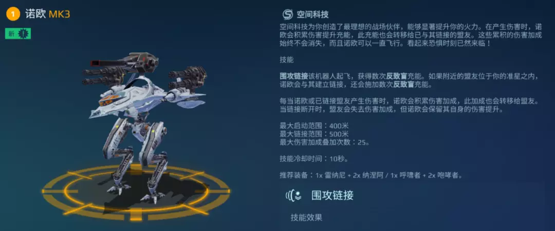 输出方面,[诺欧]搭载1重、2中,共三个武器槽位,基础火力表现出色;更关键的是,其技能可提供覆盖整个对局的持续伤害增幅,通过合理的武器搭配,整体作战能力足以比肩泰坦级单位。