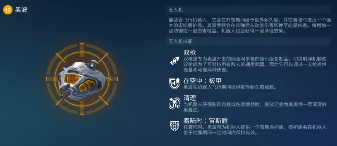 无人机方面, [奥波]作为飞行机甲的最佳搭档,其不仅搭载复刻“武器[纳涅阿]” 双属性伤害的小型双枪,还能在机甲升空时提供额外耐久点数,落地时赋予宙斯盾;更关键的是,当机甲获得防御、伤害增益时,[奥波] 会触发“清理”效果,可移除生锈、致盲、封锁 EMP 等负面状态,同步提升生存能力与容错率,让双子星无惧敌方火力与控制。