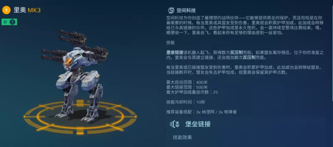 凭借高耐久与护盾特性,[里奥] 可与 [终极芬里尔] 等前排机甲配合,吸引并承受大量敌方火力,为我方输出单位创造安全的作战空间;即便孤身作战,其出色的坦度也能保证在遭遇战、拉扯战中稳定发挥,不落下风。