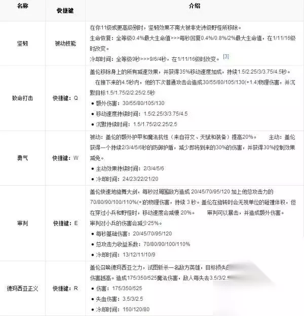 英雄属性 生命值:455(+96 / 每等级)(2087 / 等级18) 魔法值:0 (+0 / 每级) 移动速度:345 攻击速度:0.625(2.9% / 每级) 护甲值:19(+2.7 / 每等级) (64.9/ 等级18) 魔法抗性:30(+1.25 / 每等级) (51.25 / 等级18) 攻击范围:125 生命回复:8.25(+0.75 / 每等级) 攻击力:56 (+3.5 / 每级) 使用技巧 自己使用 如果盖伦能持续几秒不受到攻击,那么他的生命回复将大大增加。 勇气会提升防御型装备的效果。请根据对手的伤害类型来选择合适的防装。 盖伦只受到冷却时间的限制,幽梦之灵和残暴之力等物品对他极其有效。 敌人使用 堆护甲可以有效减少盖伦大量的物理输出。 当你的生命值偏低时,尽可能躲避盖伦,因为他的德玛西亚正义技能能够很快地斩杀你。 在树林里攻击盖伦要小心,因为你会受到审判技能造成的全额伤害。