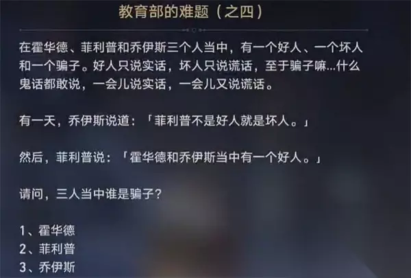 4、教育部的谜题之四 答:菲利普 分析: 假设乔伊斯是个好人并且说实话。有人认为乔伊斯是好人,菲利普是坏人,这是一个谎言。人们已经认为乔伊斯是好人,菲利普是坏人,但他说的是实话,这显然是错误的。 假设菲利普是个好人并且说的是实话。得出结论乔伊斯不是一个好人。按照乔伊斯的说法,那么霍华德就是好人。然而,人们一直认为菲利普是个好人,这显然是错误的。 假设霍华德是个好人。需要第二个假设,假设乔伊斯是骗子,菲利普是坏人。乔伊斯说的可能是真话,也可能是谎言。菲利普在撒谎。霍华德、乔伊斯都不是好人,我们已经假设霍华德是好人。所以这是行不通的。 再次假设菲利普是骗子,乔伊斯是坏人。那么乔伊斯是一个谎言,菲利普是一个骗子。假设是有效的。所以,霍华德是好人,乔伊斯是坏人,菲利普是骗子。