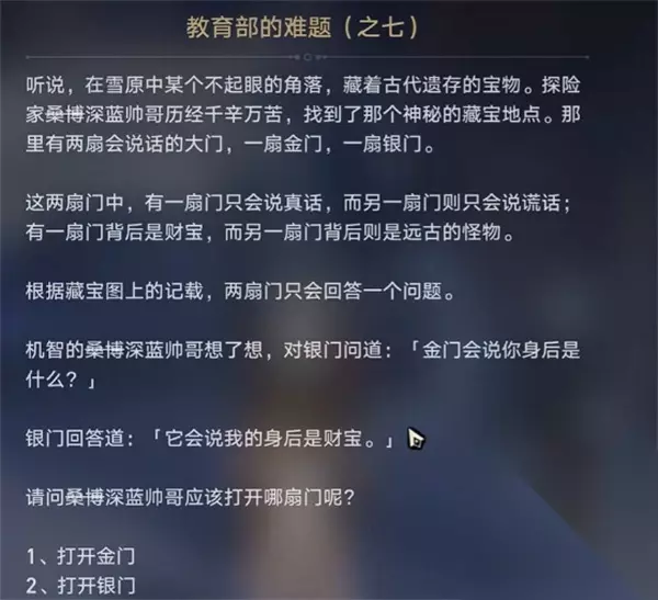 7、教育部的难题之七 答:打开金门 分析:假设银门说的是实话。如果你在金门撒谎,说银门后面有宝藏也是骗人的。由此可见,银门后面有一个怪物。金门后面就是宝藏。 假设银门说谎。如果金门说真话,银门说假话,那么金门就不会说银门后面有宝藏,而是说银门后面有怪物。由此可见,银门后面有一个怪物。金门后面就是宝藏。 让我们互相证明一下,德银门背后有怪物。金门后面就是宝藏。