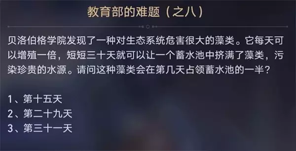 8、教育部的难题之八 答:第二十九天 分析:问题词干的价值每天都会翻倍。也就是说,一天之内可以繁殖出一半的卵子。 30天是全部,29天是一半。