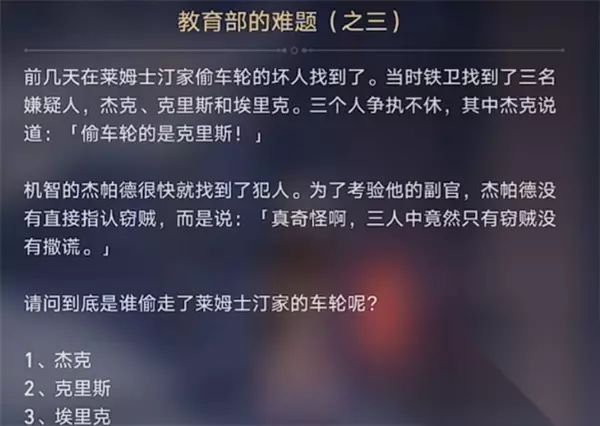 3、教育部的谜题之三 答:埃里克 分析:看题,三个人中只有小偷没有说谎,即三个人中只有一个小偷,另外两个人说谎了。 假设杰克是小偷并且他说的是实话。那么克里斯就是小偷,这是一个明显的悖论。也就是说,杰克不是小偷。因此,不是小偷的人就是在说谎,克里斯也不是小偷。那么小偷就只能是艾瑞克了。