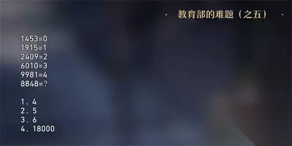 5、教育部的谜题之五 答:6 分析: 1453:没有闭合圆。 1915:9 有一个封闭的圆圈。 2409:0为封闭圆,9为封闭圆。 9981:两个9有两个闭合圆圈,8有两个闭合圆圈。 所以8848=6。