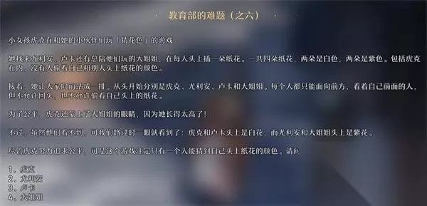 6、教育部的难题之六 答:尤利安 分析:从题干上,我们知道队伍是Hook(白)-Julian(紫)-Luca(白)-Big Sister(紫)。 排除蒙眼大姐,然后首先排除胡克。 卢卡可以看到朱利安和胡克的颜色,但是既有白色,也有紫色,所以他无法分辨自己的是白色还是紫色。 由于卢卡无法判断自己衣服的颜色,朱利安可以知道他和胡克不是同一个颜色,是紫色。