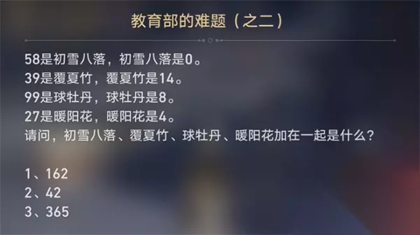 2、教育部的谜题之二 答: 162 分析:58是初雪八落,初雪八落为0。 将58 分成5 和8。58=40。 将得到的40 分成4 和0。 40=0 该问题的答案是0。 同理,可以推出 第一场雪已经下了:58=40,40=0。 夏盖竹:39=27、27=14。 球牡丹:99=81,18=8。 向日葵:27=14,14=4。 对于每朵花,第二步得到的数字40、27、81、14就是这四朵花的实数。 四种花加起来:40+27+81+14=162