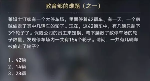 1、教育部的谜题之一 答:14辆 分析:被盗前,一辆车有4个轮子,总共有42辆车。 424=168。 被盗后只有154个轮子,所以被盗轮子的数量是。 168-154=14。 多辆汽车的车轮被盗,只剩下3个车轮,这意味着每辆车仅被盗1个车轮。 141=14。