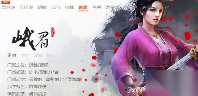 5、峨嵋派: 门派武学有云霞刺、离别刺、金顶绵掌。