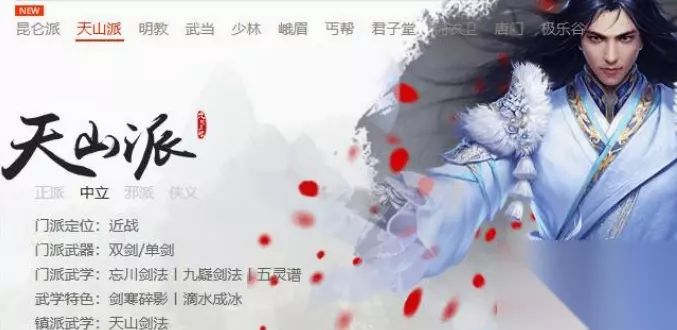 2、天山派: 门派武学有忘川剑、法九嶷剑法、五灵谱。