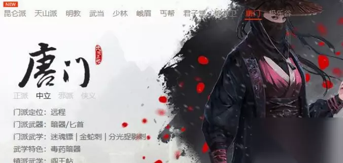 7、唐门: 门派武学有迷魂镖、金蛇刺、分光捉影刺。
