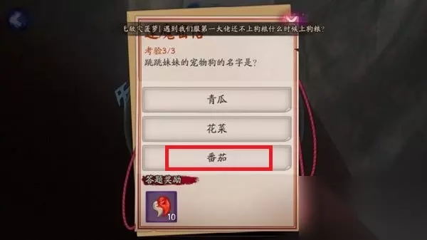 在阴阳师的逢魔密信活动中有一个问题问的是跳跳妹妹宠物狗的名字是什么,这个问题我们可以在跳跳妹妹的传记中找到答案,她的对话中多次提到番茄的尾巴,所以宠物狗的名字就是番茄。 跳跳妹妹宠物狗的名字是什么 答:番茄 跳跳家族只有一条宠物狗,它的名字就是叫番茄。