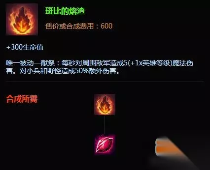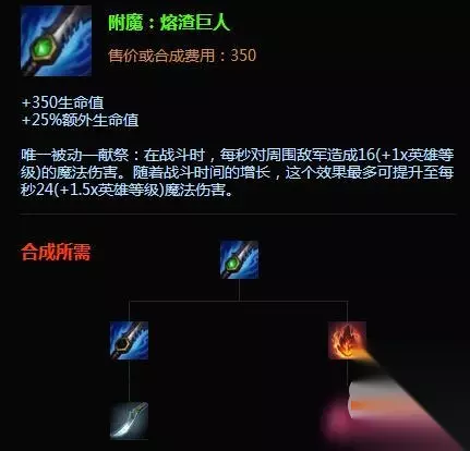 我们惊喜地看到打野坦克所期盼的25%额外生命值加成又回来了!这个属性能在后期为坦克英雄提供超额生命值,而即便在前期,刚做出熔渣巨人的猪妹所获得的生命值加成也没有比原先主宰附魔提供的500生命值少太多。于此同时,新的献祭被动提供了不俗的持续伤害,具体属性我们来看下图。