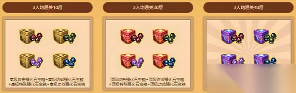 此外,玩家还可以自行进行3人组队,只要3人均通关对应难度,团队人员即可领取奖励,仅需所有成员通过10层即可领取高级强化石宝箱套装,全部通关40层即可直接领取传奇强化石套装!