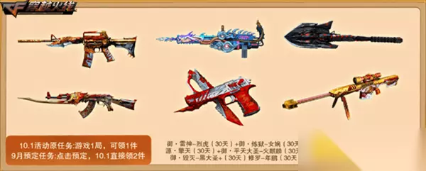 活动期间,各位CFer还可以提前预定10.1福利盛典主题活动,完成预定后即可直接在10.1当天领取源英雄级礼包一份。并且10.1盛典活动原定完成1局游戏仅能领取1件奖励的活动,在预定后还将升级为直接领取2件!