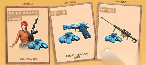 成功组团后,各位CFer还可以累计团队等级(团队等级=团员个人等级之和)赢取对应奖励,个人等级达到10级且团队等级达到20级即可在虎妞、Colt1911-萌杀或凤凰之怒之中选择1件领取,并获得2000火线币。