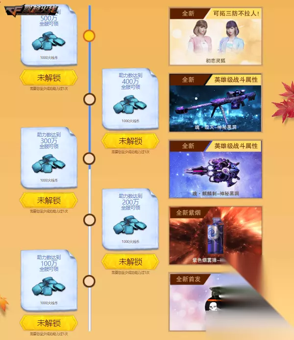 如果在预热期间,全服玩家助力达到指定数字,10.1福利盛典还将为广大玩家免费发放对应奖励,助力数达到500万即可为全服赢取1000火线币的好礼,当天成功分享页面即可为活动助力1次。