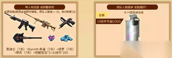 如果玩家成功与其他玩家组团成功,还可以根据团队总人数获得不同期限的闪光弹-现代金属,团队人数大于等于2人即可领取多重好礼。