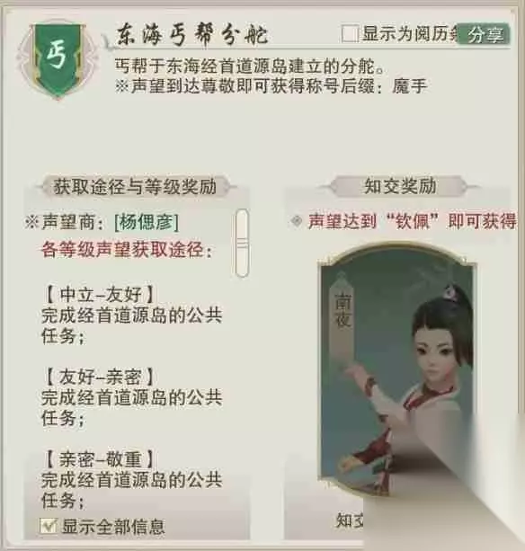 《剑网3》东海丐帮分舵声望提升方法: 1、玩家完成经首道源岛的公共任务即可提高东海丐帮分舵的声望;