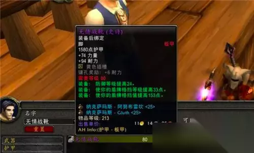 第五件装备依然是板甲,NAXX阿努布雷坎掉落的坦克鞋子“无情战靴”。这双双格挡鞋子超级适合防战和防骑,乘着P1的防战还非常强势,玩家可以入手一双。当然AH中的5000金挂价明显虚高了,2000~3000金比较合适。