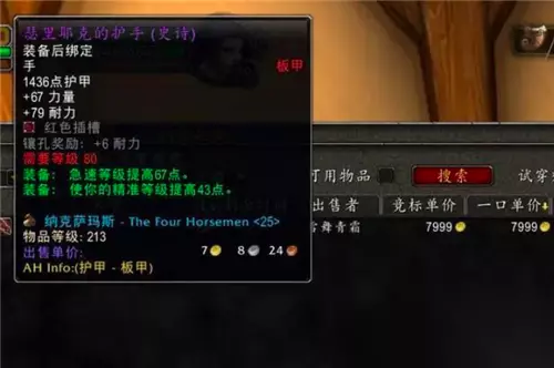 第四件装备是邪DK的BIS手“瑟里耶克的护手”,这是一件213的精准装备,掉落于25人NAXX。由于邪DK玩家数量庞大,这件护手可不便宜,AH中唯一的挂价高达8000金,其他的都已经被拍走了。瑟里耶克的护手将长期处于高位,P1中后期应该会掉到3000金以下。